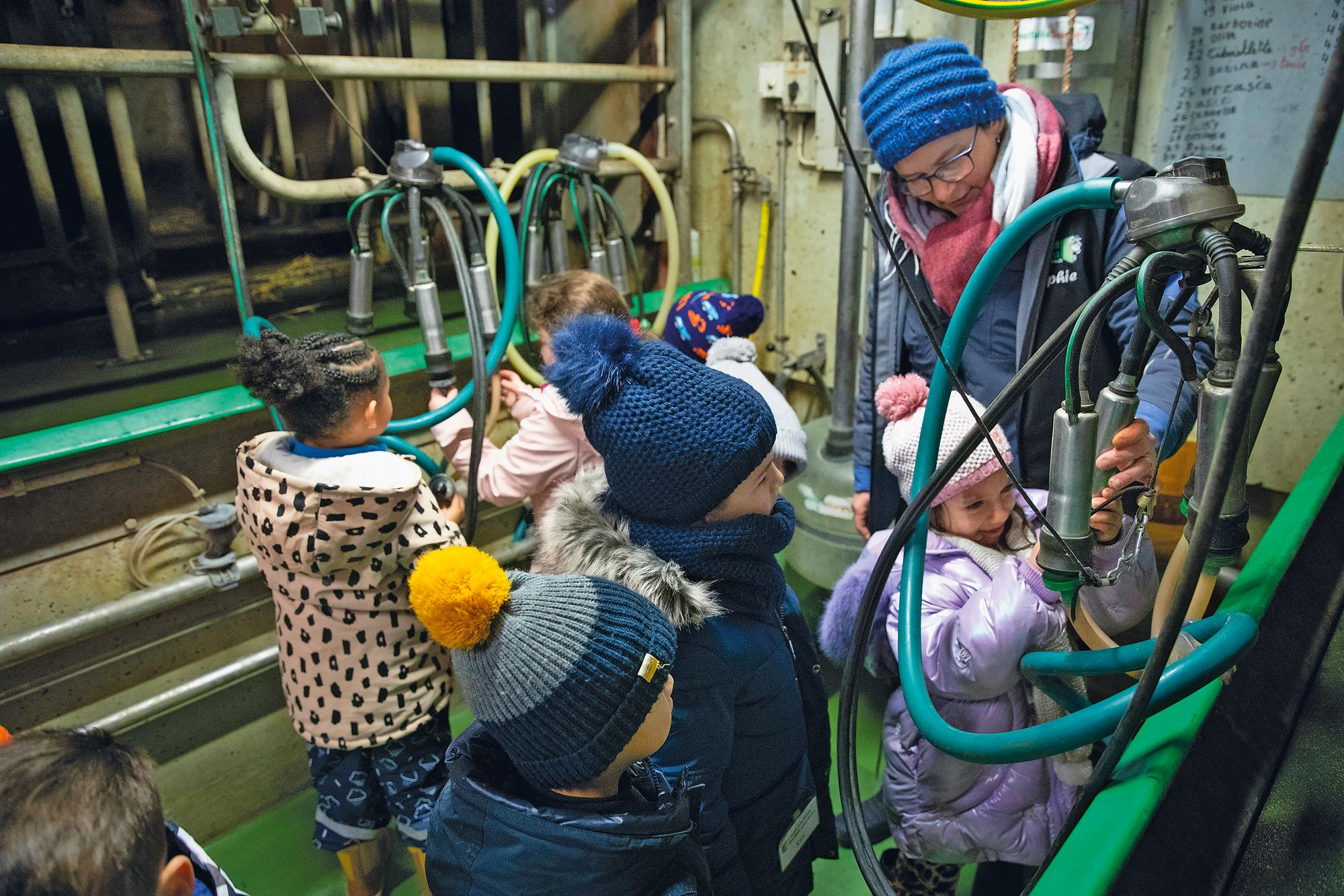 Puis la classe se scinde en deux. Un groupe part en coulisses, direction la trayeuse. L’appareil intrigue. «Attention, il fait un bruit d’aspirateur!» lance l’agricultrice avant d’enclencher l’engin. On se bouche les oreilles en rigolant. Quelqu’un sait-il quand la traite a lieu? Et combien de fois par semaine?