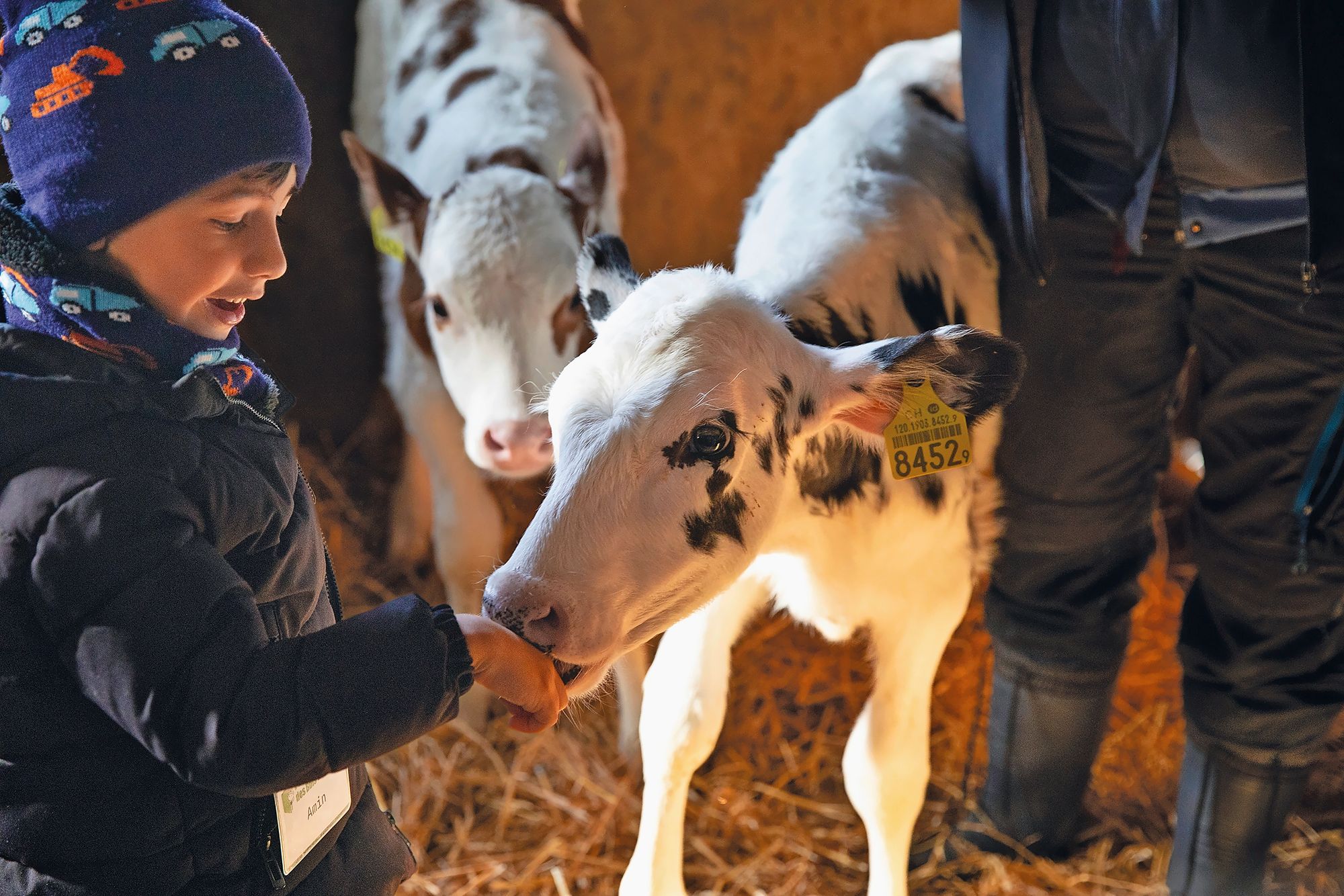 Et de ramener la petite troupe dans l’étable. Au moyen d’un quiz, Émilie propose aux enfants de faire plus ample connaissance avec les habitants des lieux. Ce qu’ils mangent, ce qu’ils produisent, leur morphologie, tout y passe – même les adultes glanent quelques informations au passage! La matinée s’achève avec une visite aux veaux. Cette fois, Maline n’hésite pas une seconde à faire un câlin à Espelette, blotti au chaud dans la paille au fond du box. Midi sonne, c’est l’heure de la pause et le moment de finir de baratter le beurre! Les enfants auront bien mérité leurs tartines.