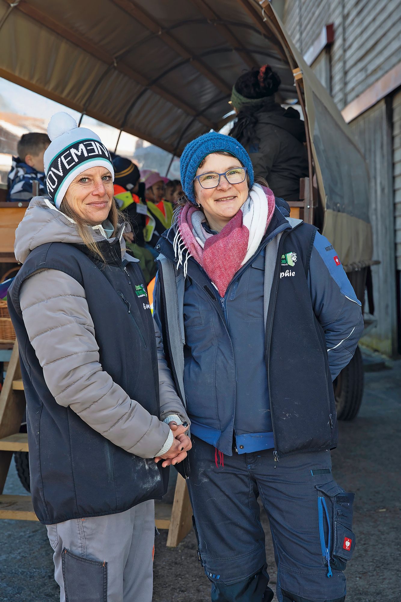 En ce matin d’automne, le thermomètre indique -1°C. Un pâle soleil tente de faire fondre le givre qui habille les champs de Nicolas Boudry, à Écoteaux (VD). Deux silhouettes bien emmitouflées remontent le chemin: Sophie, sa femme, et Émilie Mettraux, qui la seconde, vont accueillir les enfants à l’arrêt de bus.
