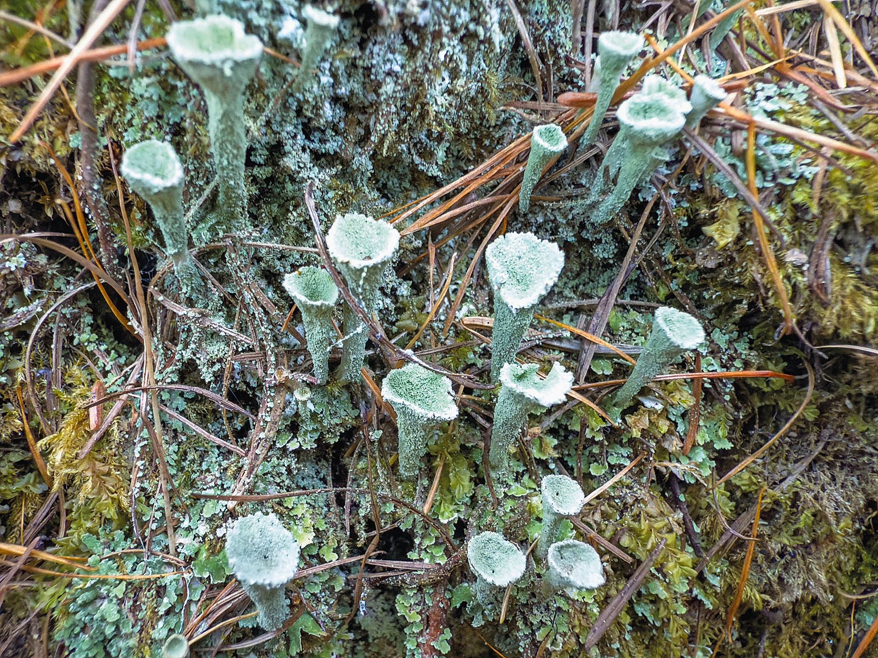 Bien que de petite taille, ce lichen – Cladonia fimbriata pour les intimes («Cladonia» vient du grec «klados» qui signifie «rameau») – surprend par sa forme en trompette. Celle-ci joue un rôle important pour la reproduction, puisque ce chapeau sert de refuge pour les algues ou les cyanobactéries qui aident à disperser les spores et à la photosynthèse. On le trouve en général dans les zones à l’ombre, sur le bois, les troncs d’arbres, le sol ou les mousses sur les rochers.