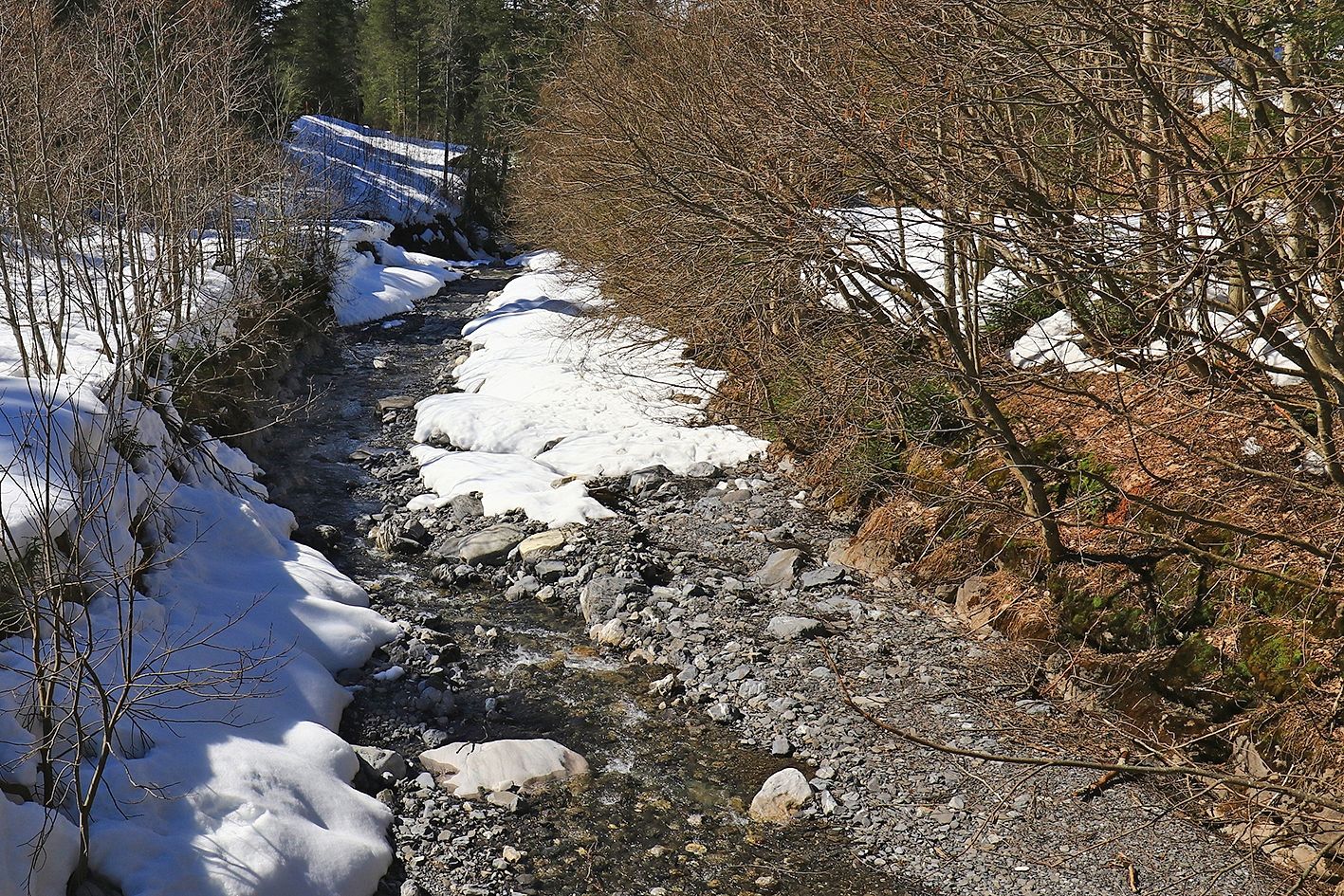 Lors de fortes chutes de neige, le tracé pédestre qui permet de rejoindre Solalex depuis Cergnement retrouve sa blancheur immaculée. Le jour de notre randonnée, cependant, les paysages sont partiellement dénudés, mais la neige tapisse encore les rives qui bordent l’Avançon. Paysage silencieux derrière lequel émerge déjà le massif des Diablerets. La rivière fait l’objet d’un projet expérimental visant une meilleure intégration des techniques de génie végétal pour la protection des berges.