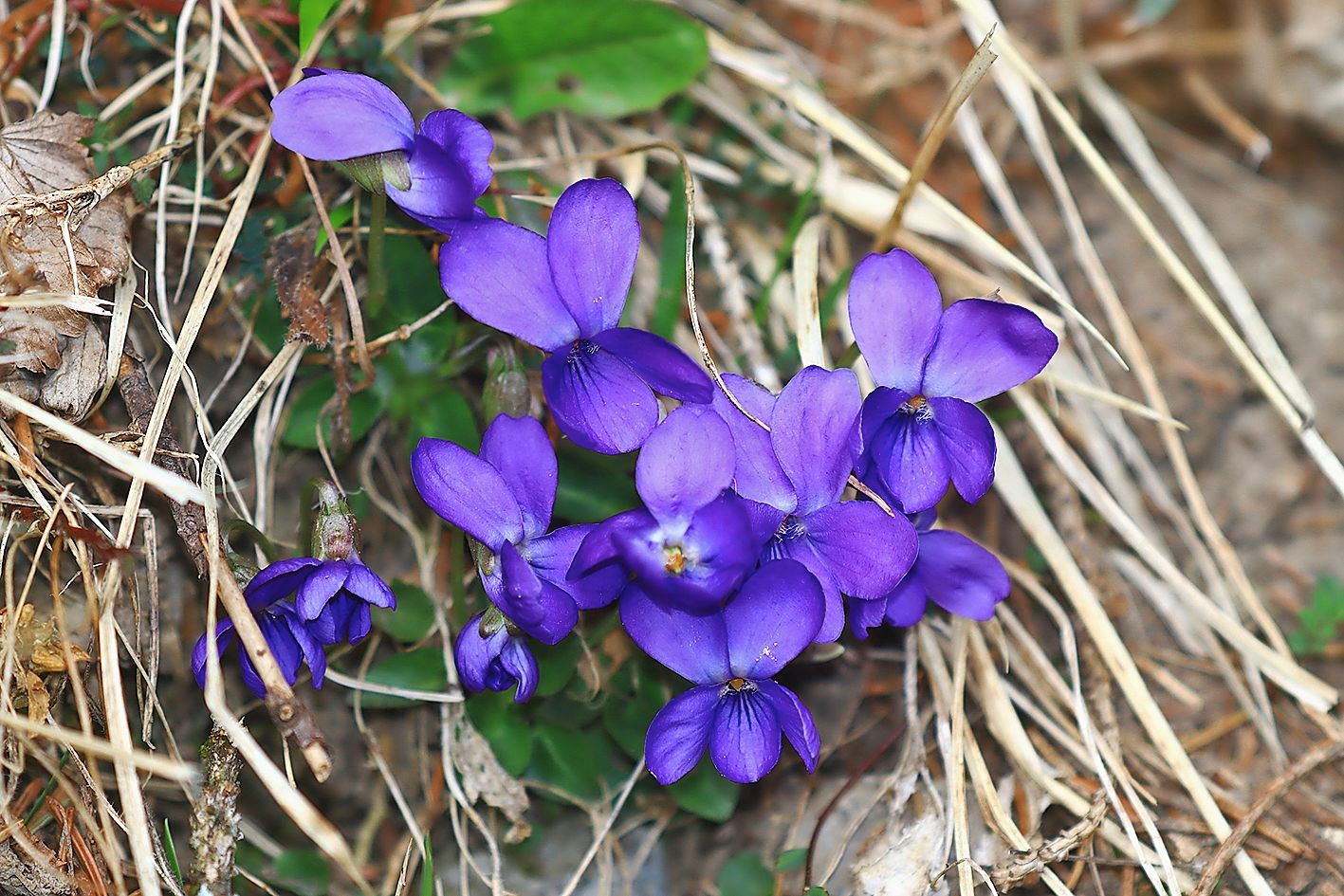 En descendant par la route, pratiquement sans neige, nous sommes passablement surpris par le nombre d’espèces de fleurs en plein épanouissement dans le talus. Émergeant d’un tapis d’herbes sèches ou installées sur des fourmilières, les pétasites, les violettes (photo), pulmonaires et hellébores fétides arborent des corolles dans leur première fraîcheur. Au milieu d’un groupe d’hépatiques d’un bleu intense, une seule d’entre elles se démarque par sa belle teinte rose.