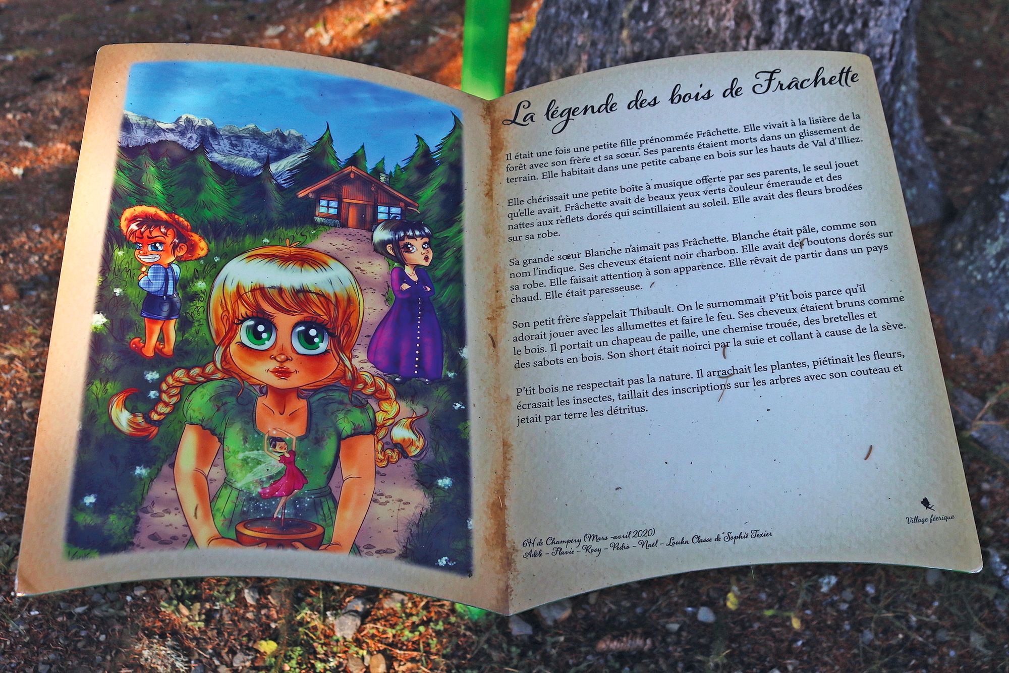 Par deux fois sur le sentier de crête, nous tombons sur les panneaux illustrant un sympathique chemin balisé: La légende des Bois de Frâchette. L’histoire d’une mignonne petite fille vivant, avec son frère et sa sœur, dans une petite cabane de bois sur les hauteurs du val d’Illiez. Ce sentier balisé destiné aux familles demande tout de même un certain effort. Son tracé s’étire sur 6,5 km (2h30 et dénivelé de 360 m), tant dans le village de Champoussin qu’au cœur du joli relief collinéen qui l’environne.