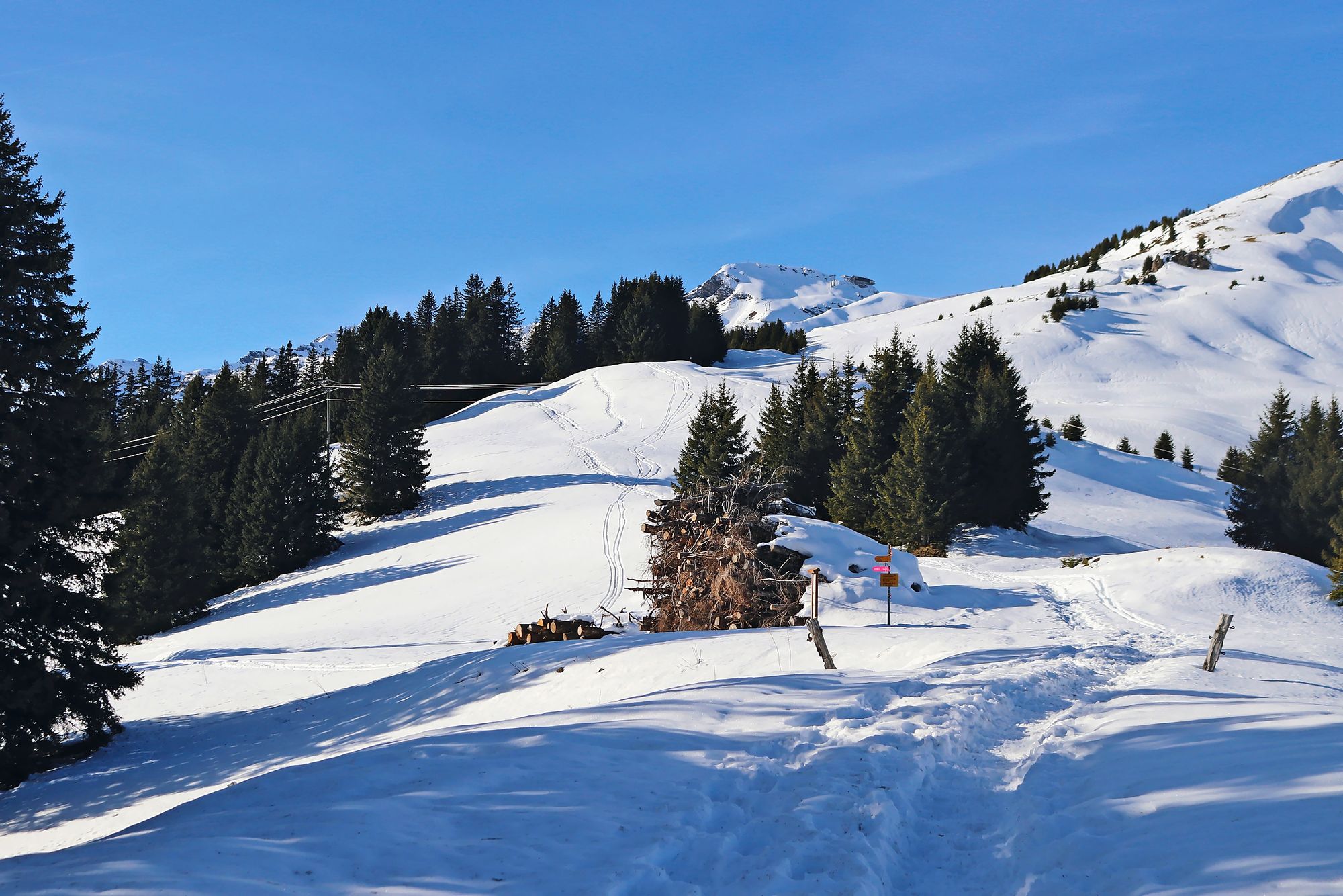 Suivre la crête, plus abrupte que la large piste, s’avère intéressant. La chute des feuilles laisse des ouvertures sur le panorama montagneux et les empreintes de mammifères dans la neige y sont étonnamment nombreuses. Lièvre, chamois et chevreuil peuplent ces lieux. Quant à l’écureuil qui nous observe (photo), légèrement masqué par le tronc d’un épicéa, il arbore à la pointe des oreilles de longs plumets de poils. Particulièrement fournis en hiver, ils réduisent une déperdition de sa chaleur corporelle.