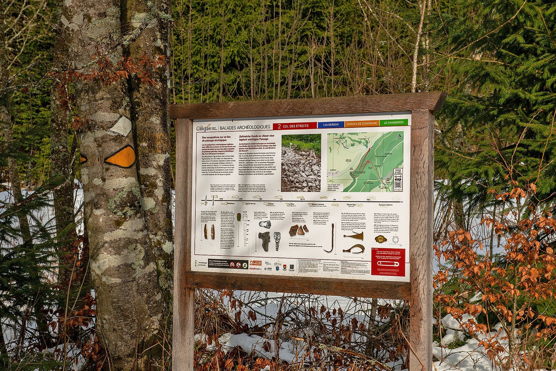 Les panneaux didactiques invitent à découvrir plusieurs points historiques de la région. Au col des Étroits, pont entre la Suisse et la France voisine (Pontarlier), on apprend l’occupation du site durant le néolithique, l’âge du Bronze, l’âge du Fer et l’époque romaine, où les passages fréquents ont laissé derrière eux de nombreux objets, tels des fibules, des clous de chaussures, des bagues ou des crochets de crémaillères. Des déplacements presque ininterrompus jusqu’à nos jours.