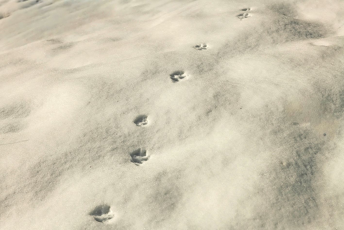 Très discrets mais présents tout autour de nous, de nombreux animaux ne laissent pas deviner leur passage, si ce n’est en hiver. Un jour ou deux après une chute de neige, la poudreuse offre une carte de leurs allées et venues. Là, l’enquête commence, les indices et les hypothèses s’amassent; il s’agira alors d’étudier formes, taille, allures, voies et alignement – l’identification des empreintes n’est pas un art qui s’improvise. On y lira le passage du lièvre variable, de l’écureuil ou du chevreuil.