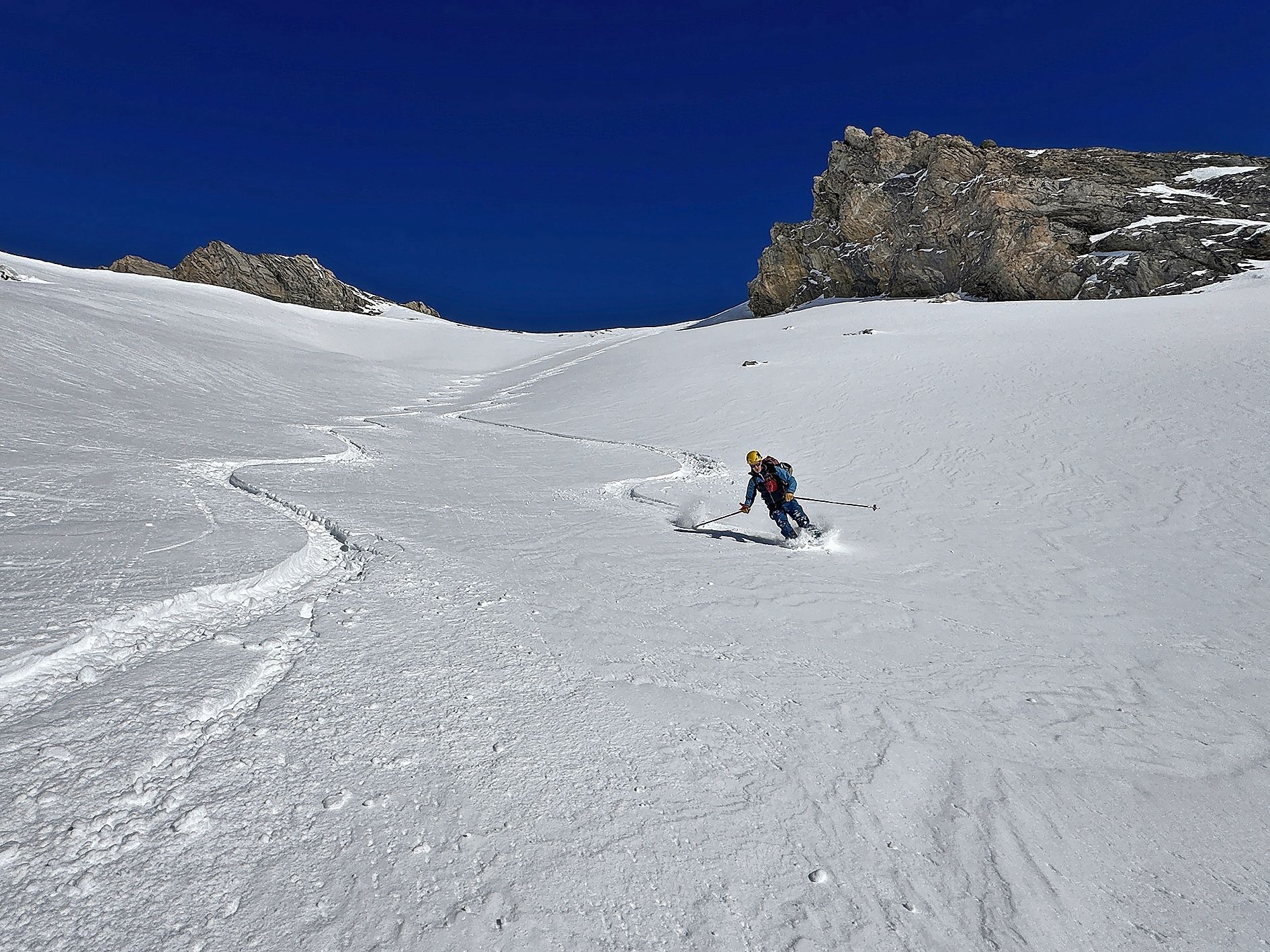 Le rêve de tout skieur de randonnée: une grande pente, régulière, inclinée. Par neige légère, les courbes s’enchaînent presque sans effort et malgré les cuisses qui chauffent, un large sourire illumine les visages. Revers de la médaille, le danger d’avalanche peut s’avérer sérieux dans ce genre de terrain, où leur taille prend parfois une ampleur impressionnante. Dans le doute – il sera déjà peut-être apparu à la montée –, on n’hésitera pas à interrompre son ascension une fois l’arête de Nusey atteinte.