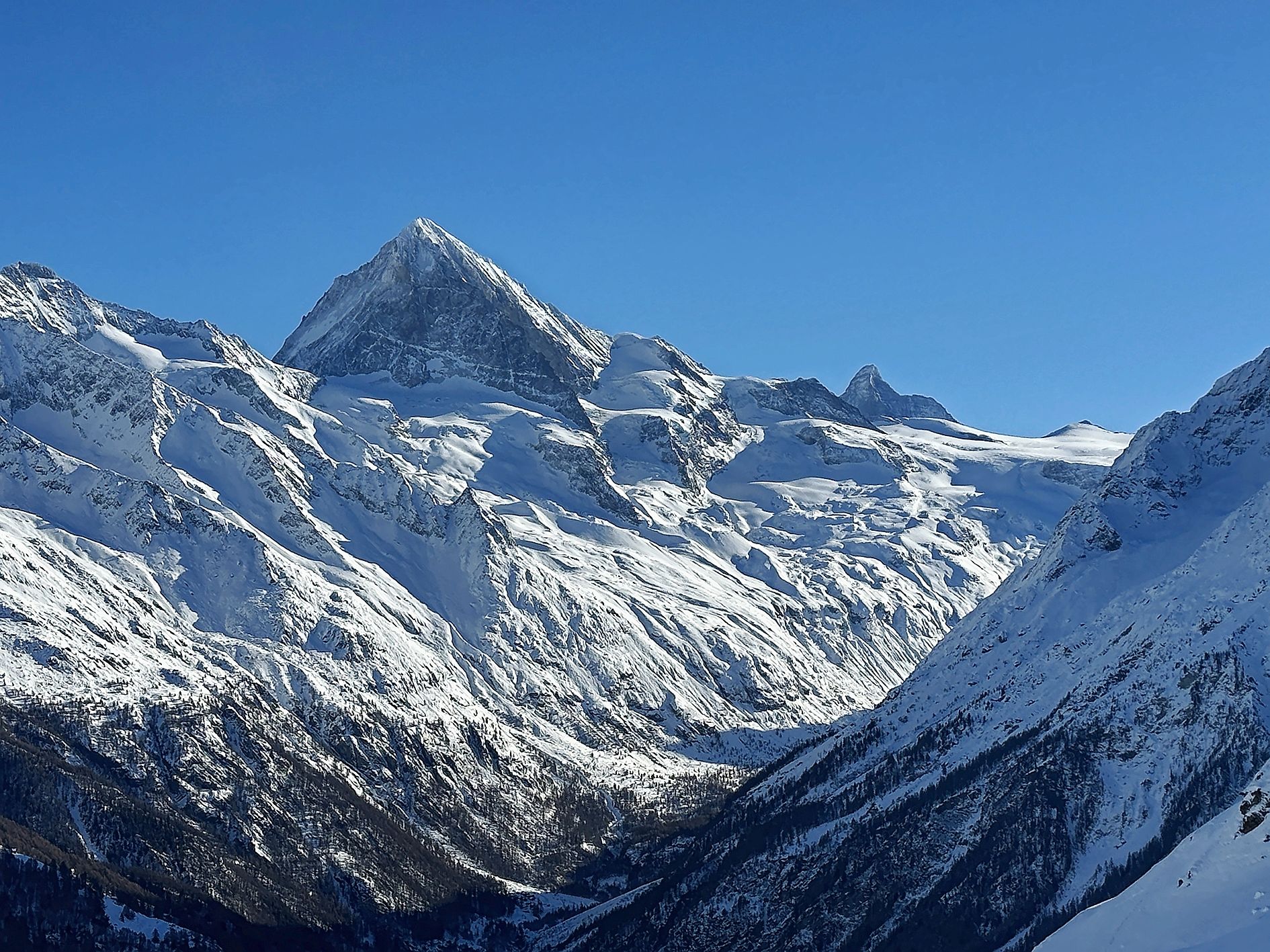 Visible loin à la ronde, la Dent-Blanche, reine du val d’Hérens, se montre ici telle une pyramide, éclipsant sans mal le Cervin qui sait aussi parfois rester à l’arrière-plan. La «Monstrueuse coquette» de Maupassant, guère plus blanche qu’une autre, aura vu son nom échangé avec celui de la Dent-d’Hérens, qui elle se part de blanches barres de séracs sur son versant nord, mais se situe hors du val d’Hérens. Erreur de cartographe, qui n’a jamais été corrigée, mais qui ne semble pas offusquer les deux cimes…