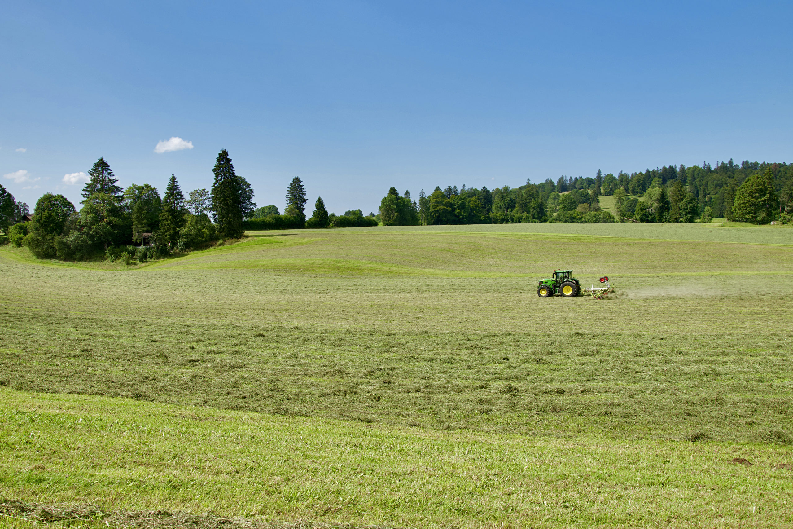 Le soleil d’arrière-été fait sécher les herbes coupées. Le parfum des foins est caractéristique de la belle saison. Durant la première partie de la randonnée, on observe des tas de graminées soigneusement organisés qui attendent d’être récoltés. Un peu plus loin, des tracteurs effectuent inlassablement des allers et retours dans les champs pour ne laisser que de l’herbe rase. Cet apport nutritionnel est important pour le bétail durant l’hiver.