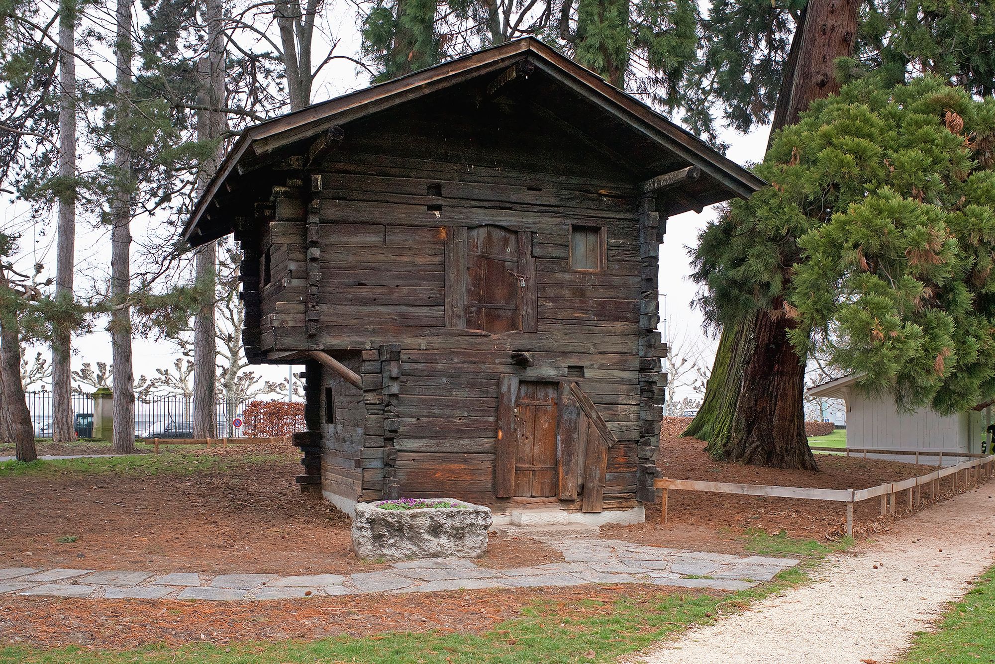 Ce grenier alpestre du XVe siècle a été déplacé à Genève pour l’Exposition nationale suisse en 1896, puis déménagé l’année suivante dans le parc des Eaux-Vives.