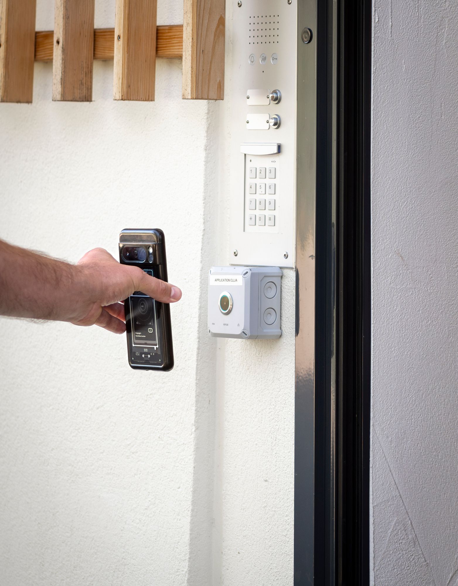 Devant la porte, l’utilisateur scanne avec son smartphone le code QR affiché. L’application vérifie immédiatement si l’utilisateur possède l’autorisation d’accès nécessaire, et si c’est le cas, un code d’accès unique, temporaire et crypté, est généré sur le téléphone. L’utilisateur le présente devant la caméra du boîtier qui le décrypte. Cela permet de déterminer qui a généré un accès, pour quelle porte et à quel moment. Si le contrôle est réussi, la porte s’ouvre, l’accès est enregistré et visible par l’exploitant.