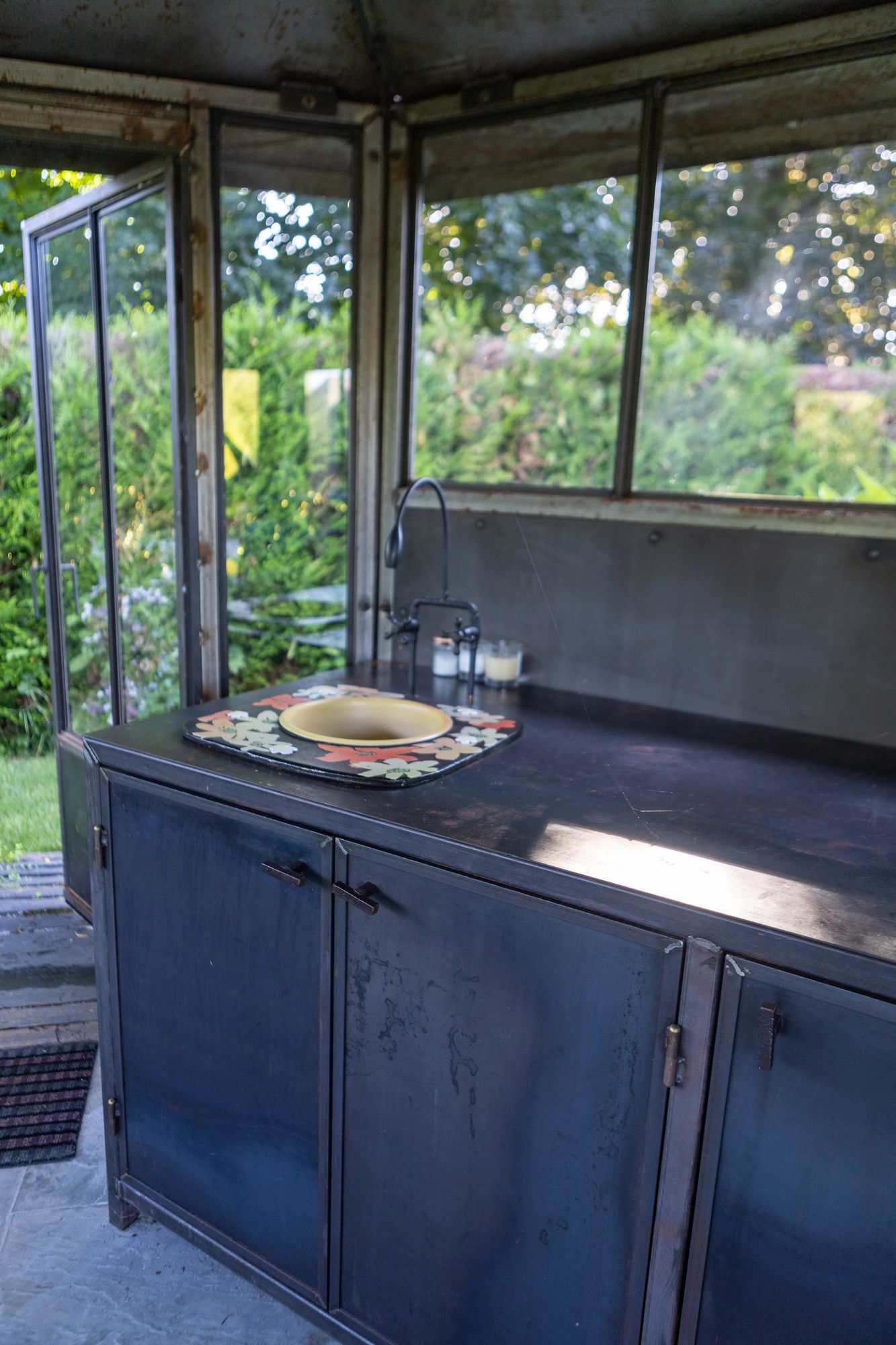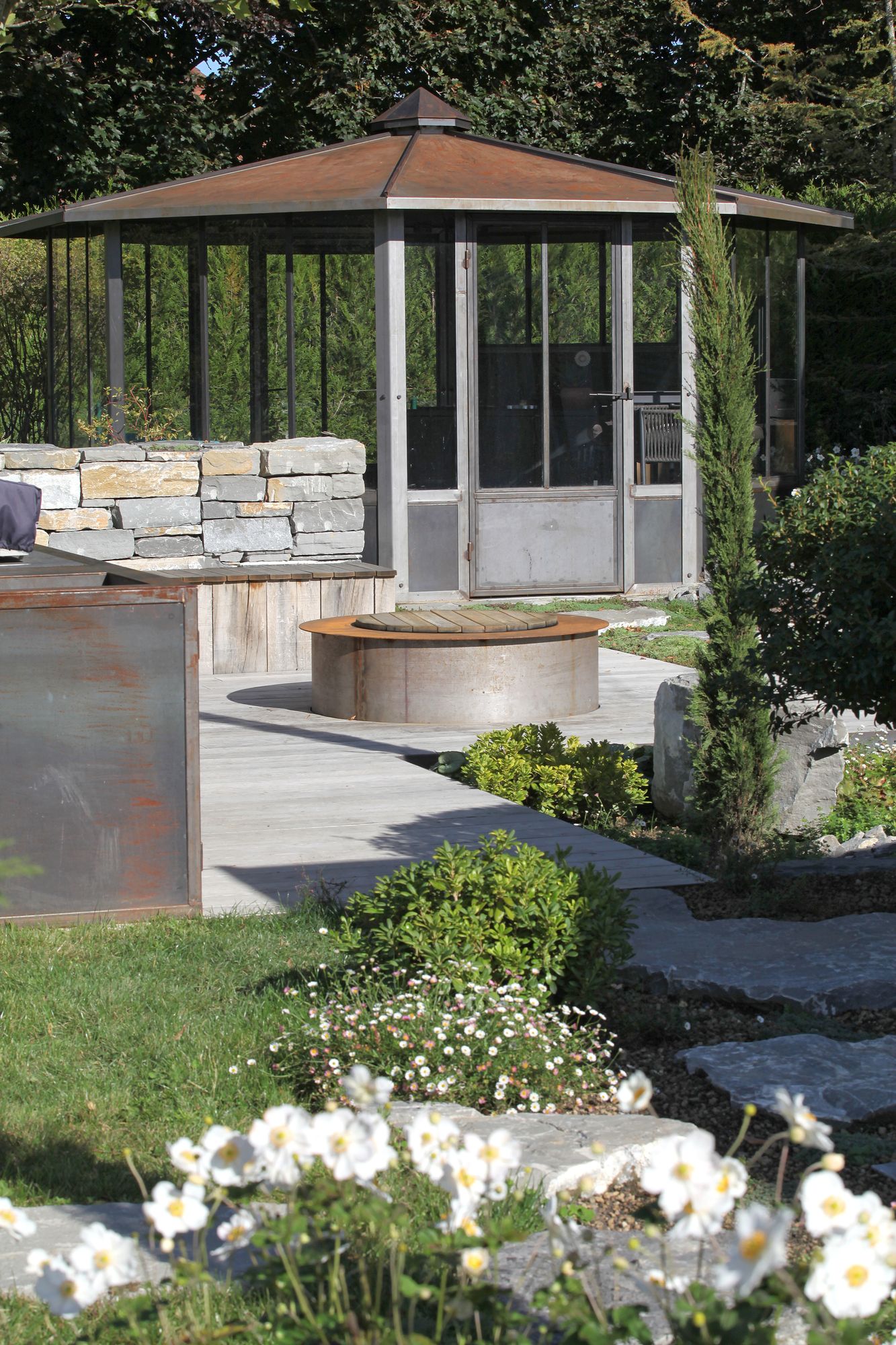 Ni serre ni pergola, voici la «Sergola», néologisme inventé non sans malice par les créateurs de Mise en Scène Architecture. Et pour cause: cette structure réunit le meilleur des deux mondes avec son toit métallique, ses parois vitrées et son usage quatre saisons. Entièrement réalisée au sein de l’atelier de l’entreprise vaudoise, elle est pensée comme une vraie pièce à vivre. Deux fauteuils bas, deux chaises hautes, un évier avec eau et un petit réfrigérateur en font un boudoir discret posé dans le jardin. Née du désir d’un couple de familles recomposées d’ajouter une pièce intime, elle accueille une ou deux personnes à la recherche d’un lieu pour se retrouver au calme. Partiellement enrobée de terre et protégée par la végétation, elle offre une perspective neuve sur la maison et le jardin qui l’entoure.