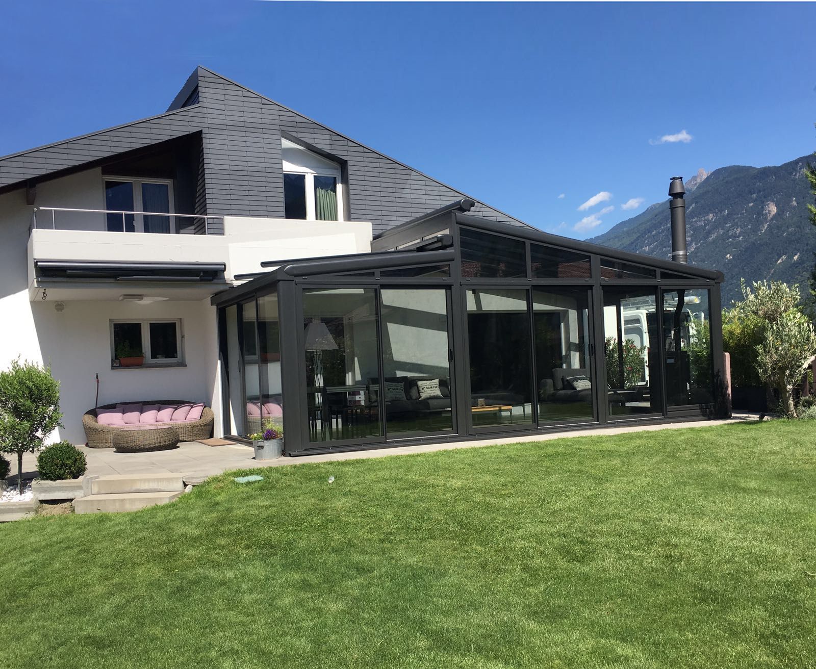 Depuis plus de trente-cinq ans, BTA Sion façonne des vérandas dans son atelier de la capitale valaisanne. «La fabrication intégrale des structures en aluminium thermolaqué est réalisée sur place, précise Jean Dussex, directeur de l’entreprise. Pour cette véranda, le choix s’est porté sur une toiture à deux pans, décalés, afin de s’intégrer au mieux à la maison.»