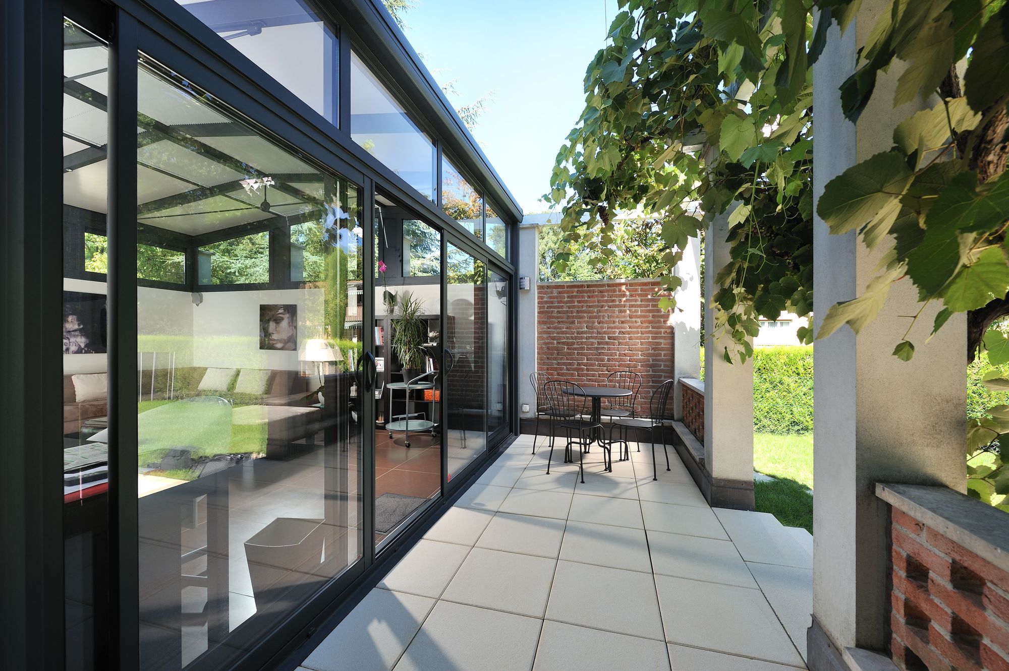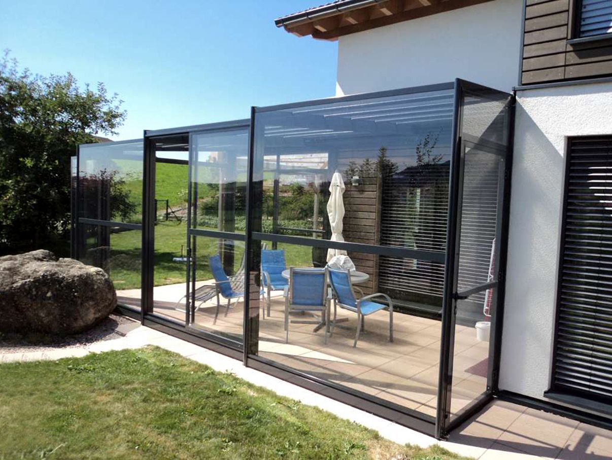 L’abri de terrasse est une solution qui s’avère efficace pour profiter de sa terrasse toute l’année sans nécessiter d’imposant ajout. La société Europa – Habitech SA s’est fait un nom dans les abris de piscine depuis plus de quarante ans; toutes leurs constructions sont fabriquées sur mesure dans leurs ateliers de Dompierre (FR). C’est le cas de cet abri de terrasse mural télescopique, équipé d’une porte coulissante. «Sa structure est conçue en trois parties, explique Nadia De Rossi. Il peut donc se rétracter pour perdre deux tiers de sa longueur. L’avantage de cette structure réside dans le fait que des fondations ne sont pas nécessaires, ce qui en fait un modèle peu coûteux. L’hiver, on peut y installer un chauffage d’appoint et à la belle saison, on peut tout simplement rétracter l’abri pour profiter pleinement de sa terrasse en plein air.»