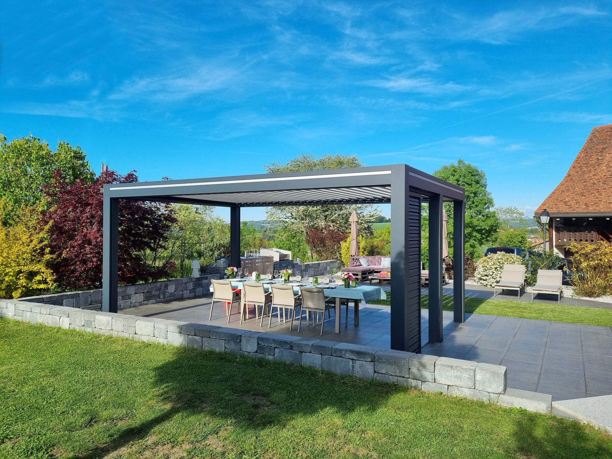 La pergola, c’est un moyen de jouir d’une pièce supplémentaire au cœur du jardin. Qu’on la rêve en salle à manger ou en séjour au grand air, elle permet de profiter de son extérieur tout en se sentant comme à la maison. Cette création de l’entreprise romande Espace et Lumière est dotée de lames orientables à double paroi, tandis que les platines et les vis sont totalement invisibles afin de renforcer la sobriété esthétique de l’ensemble. Sur un côté, un panneau brise-vue fixe est agrémenté de lames en aluminium orientables. Installée à deux pas d’une ancienne grange, cette pergola fait dialoguer ancien et moderne en mettant en valeur à la fois le jardin et le patrimoine bâti.
