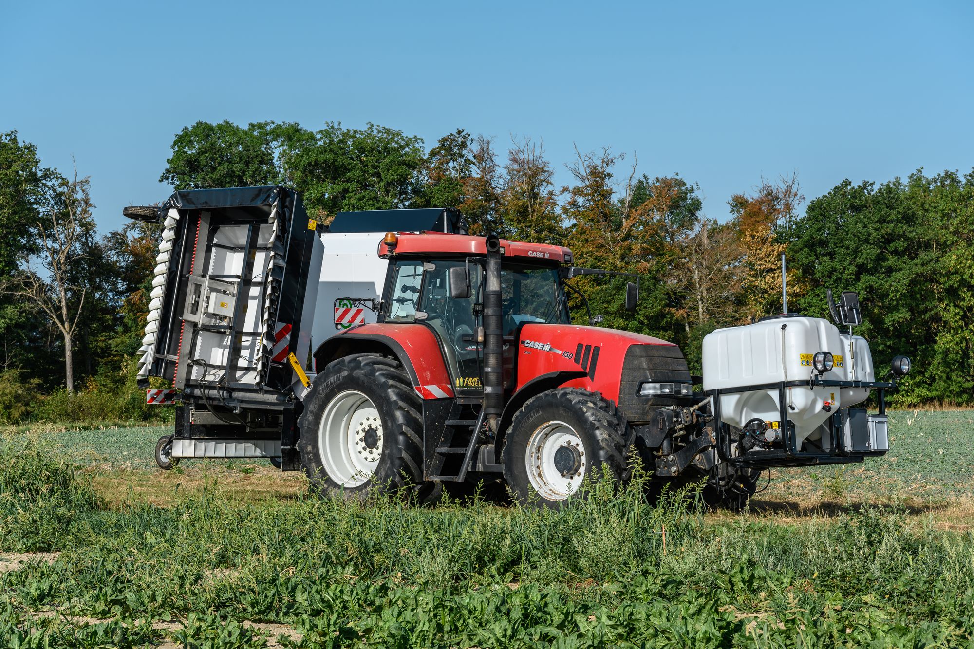Le pulvérisateur se compose de trois parties parfaitement semblables. Chacune compte deux capteurs, évaluant la profondeur et ciblant la plante à traiter. Un total de 156 buses giclent de manière ciblée, avec une précision de l’ordre de 6 centimètres. À l’avant du tracteur, deux cuves – l’une de 200 et l’autre de 500 litres – permettent de refaire une préparation de bouillie dans le champ. Le système est alimenté électriquement grâce à la prise de force et se contrôle via une tablette.