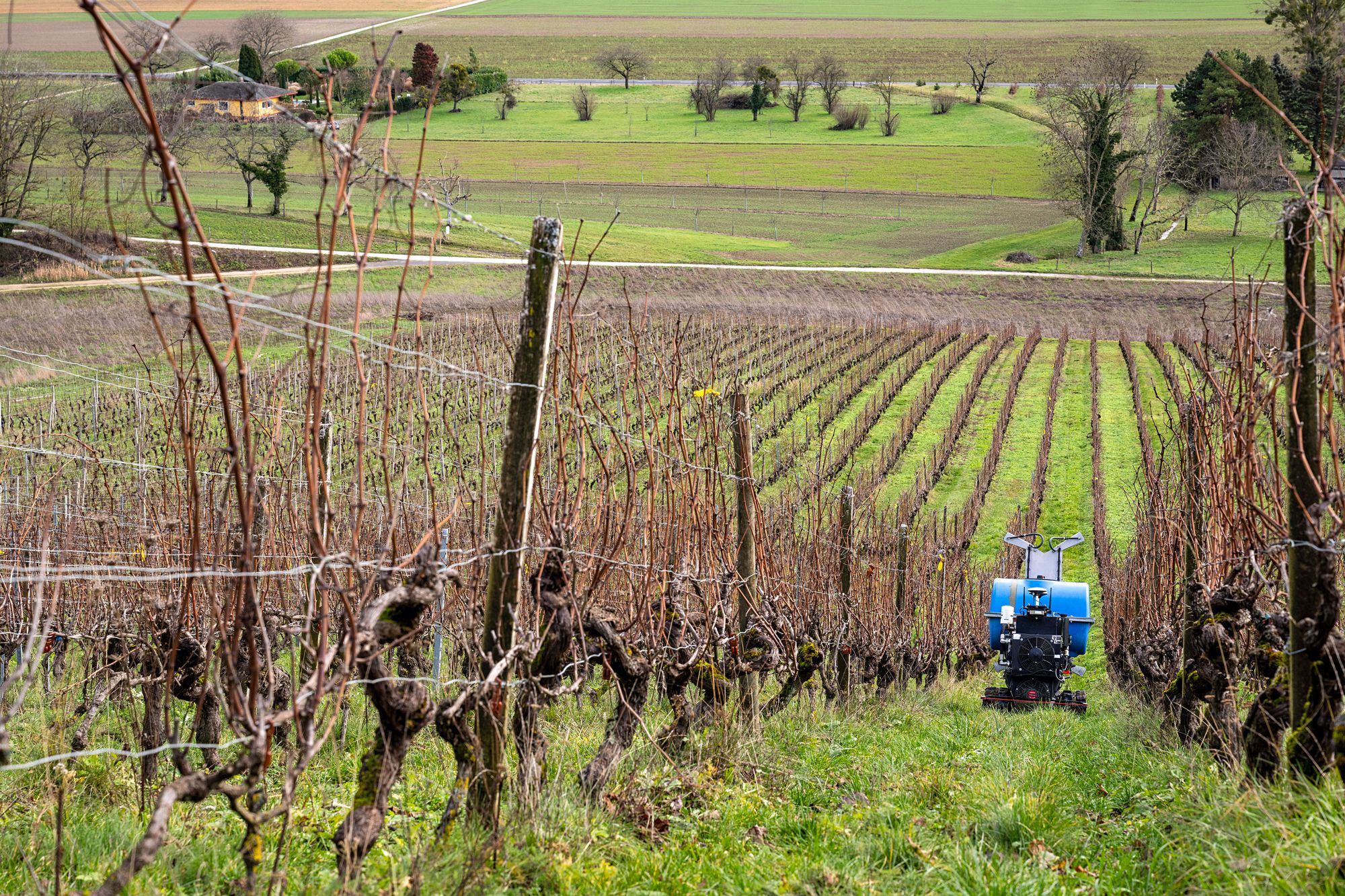 Il nous fait une démonstration au-dessus de Mathod, dans un vignoble boueux après les pluies abondantes. La machine s’enclenche d’un tour de clé et se met à ronronner. Sensible à l’écologie, Marc Stevanin a cependant opté pour un moteur thermique de 27 chevaux. L’électrique aurait posé de nombreux problèmes, dit-il, précisant toutefois que, comparé à un tracteur, son robot, beaucoup plus léger, consomme moins de carburant.
