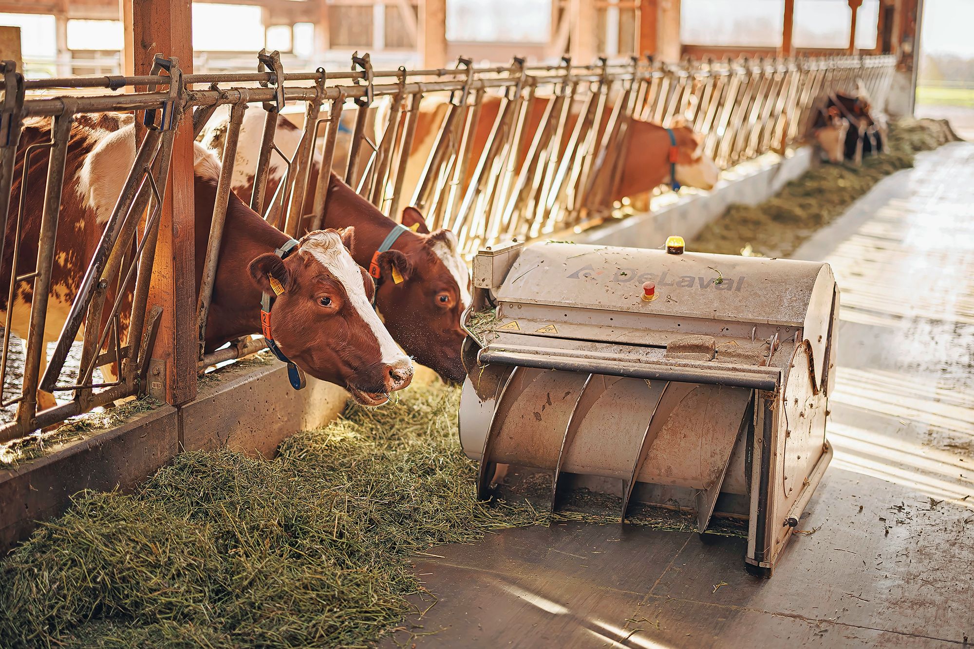 Pourtant, la fée du logis n’est pas notre hôte, mais un robot pousse-fourrage d’un mètre de large, qui circule silencieusement dans le bâtiment. Équipé d’une pièce rotative en colimaçon, l’engin ramène le foin dans les auges tout en l’aérant, ce qui évite de devoir le faire à la fourche.