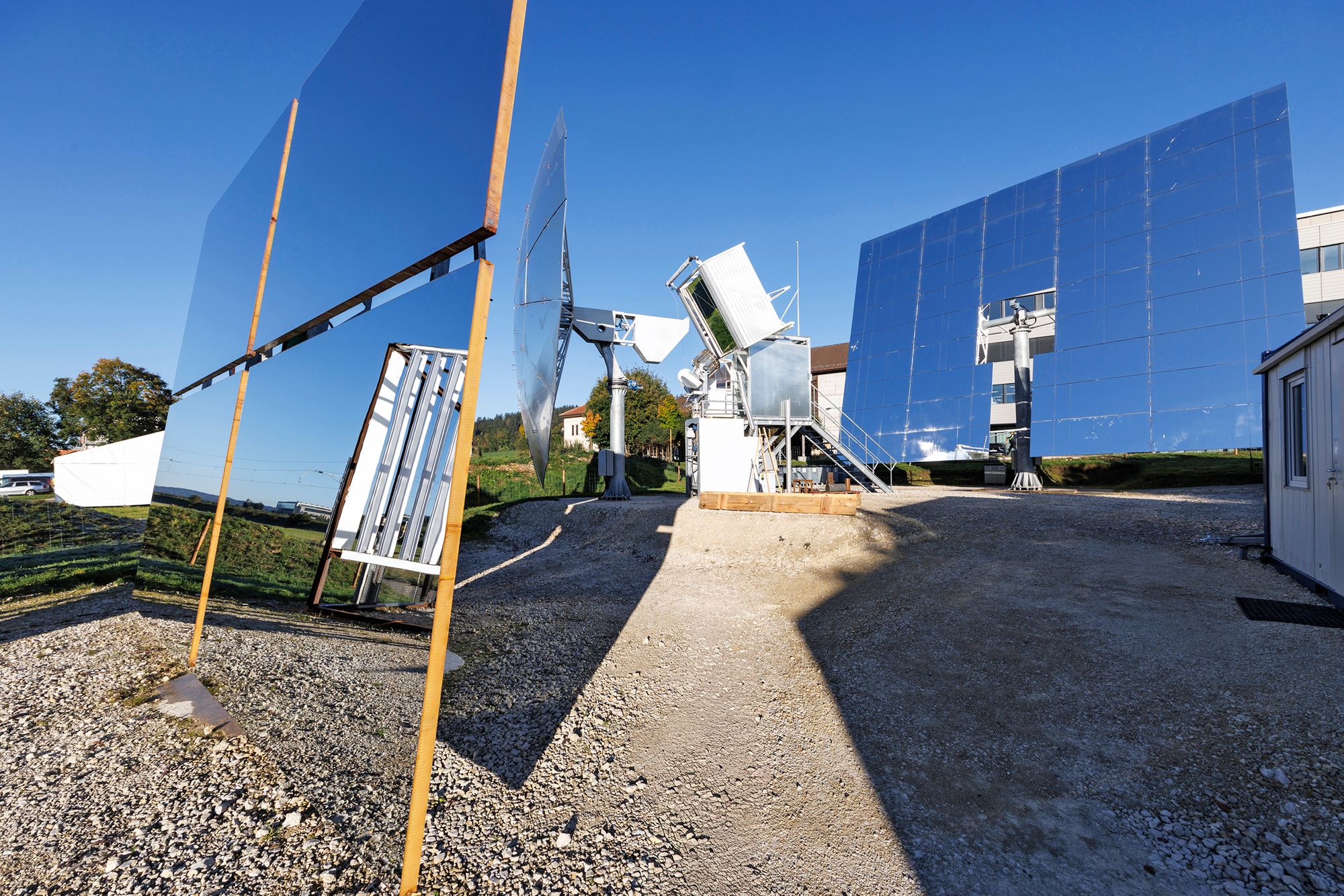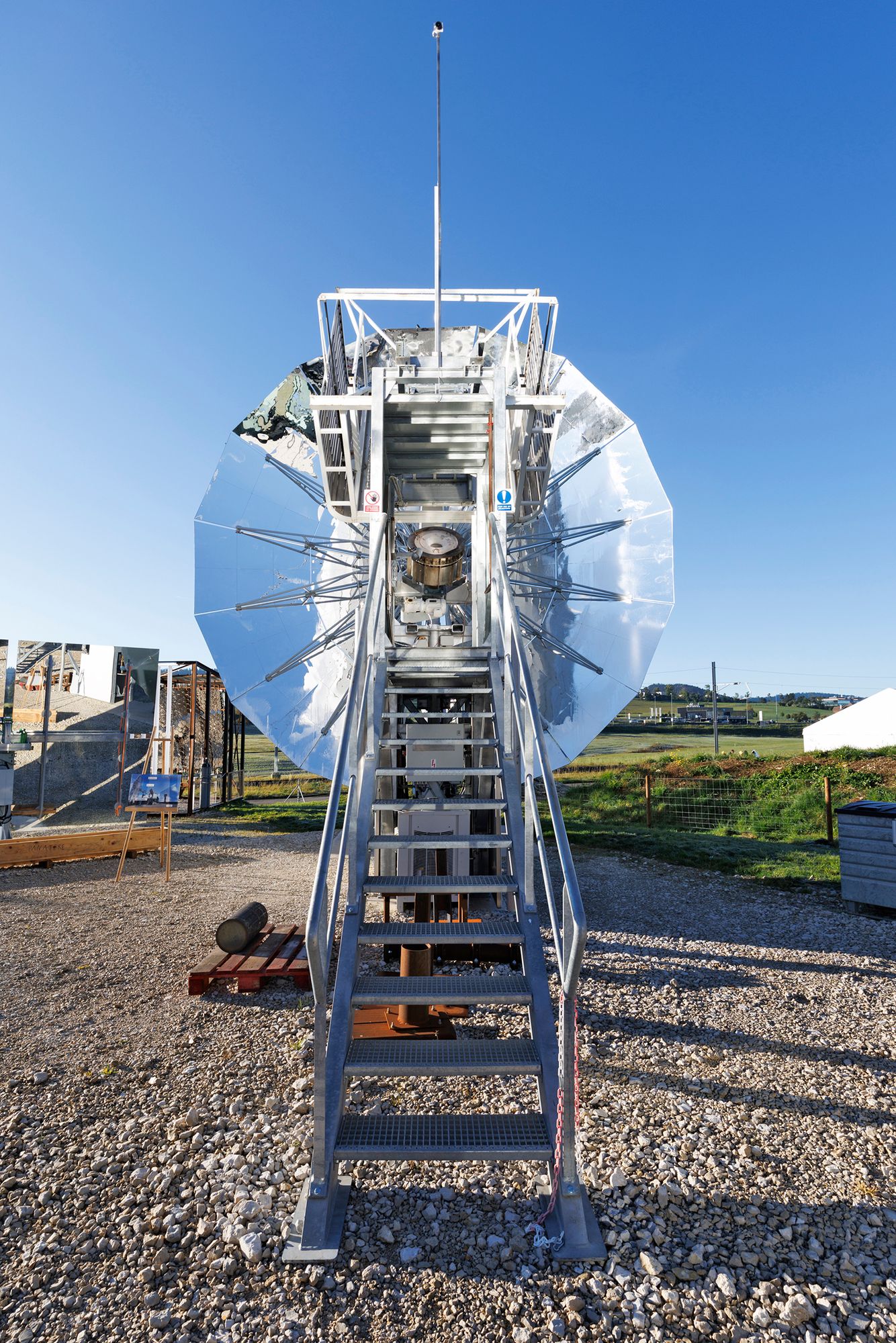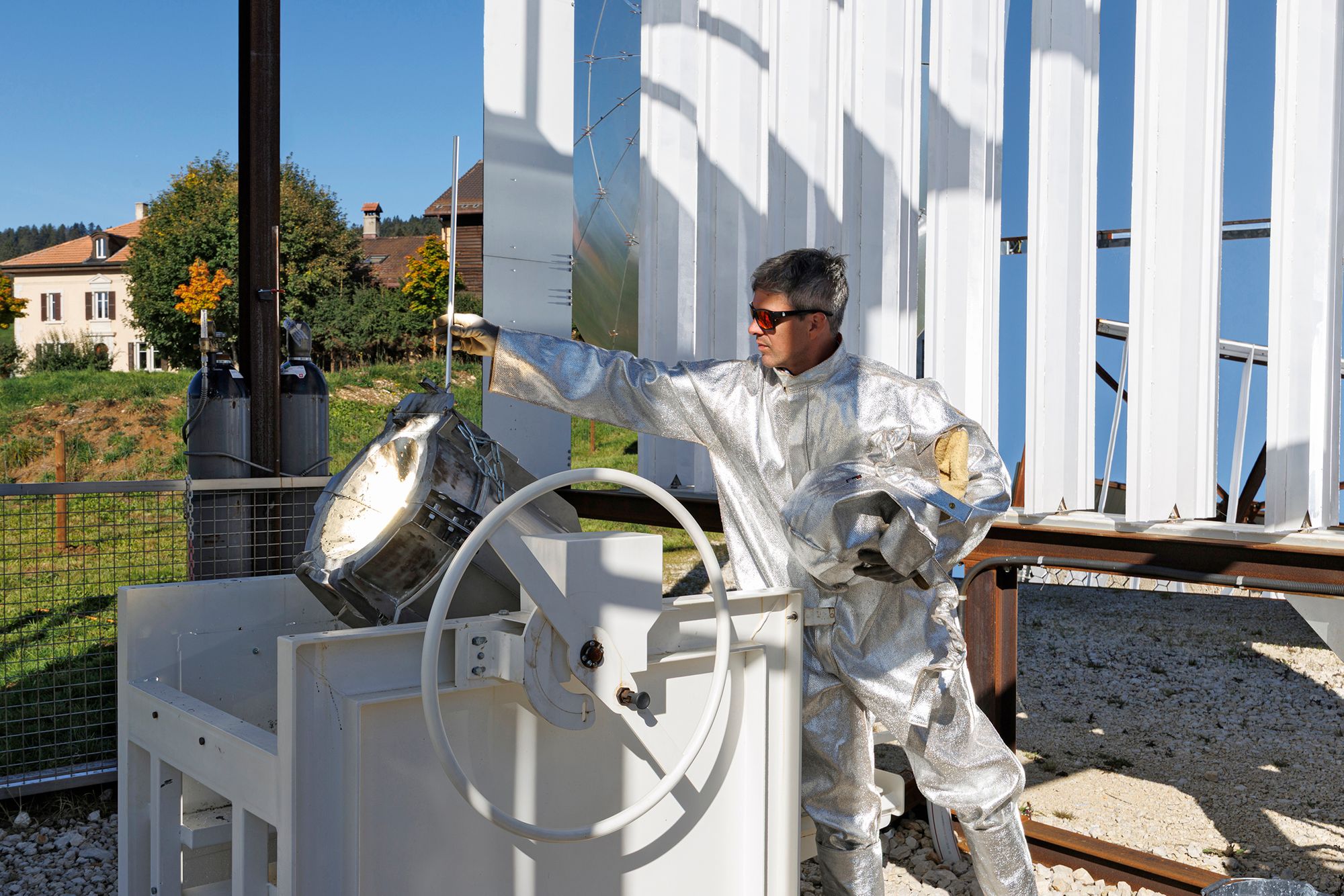 Trônant au cœur du site, un impressionnant panneau de 140 m2 attire l’œil des passants. Composée de miroirs à forte réflectivité, semblables à ceux des satellites, cette pièce appelée héliostat suit le soleil, multipliant jusqu’à 2500 fois son intensité. À son foyer, la vitre en quartz laisse passer les rayons concentrés dans un réacteur à fusion, afin de chauffer à près de 2000°C. «C’est la journée idéale car il n’y a aucun nuage, se réjouit Florian Broye, le fils du directeur. Par contre, il y a parfois du vent, de la neige et du sable du Sahara. La structure a dû être renforcée et un prototype plus petit a été construit, notamment pour supprimer les reflets parasites qui gênaient les riverains.»
