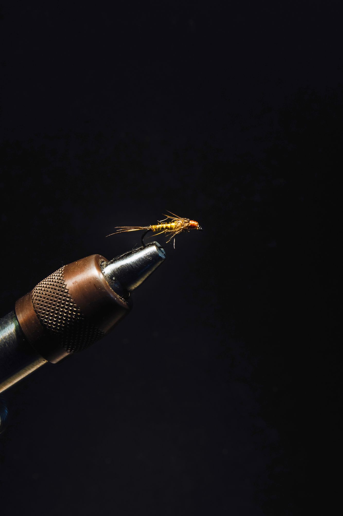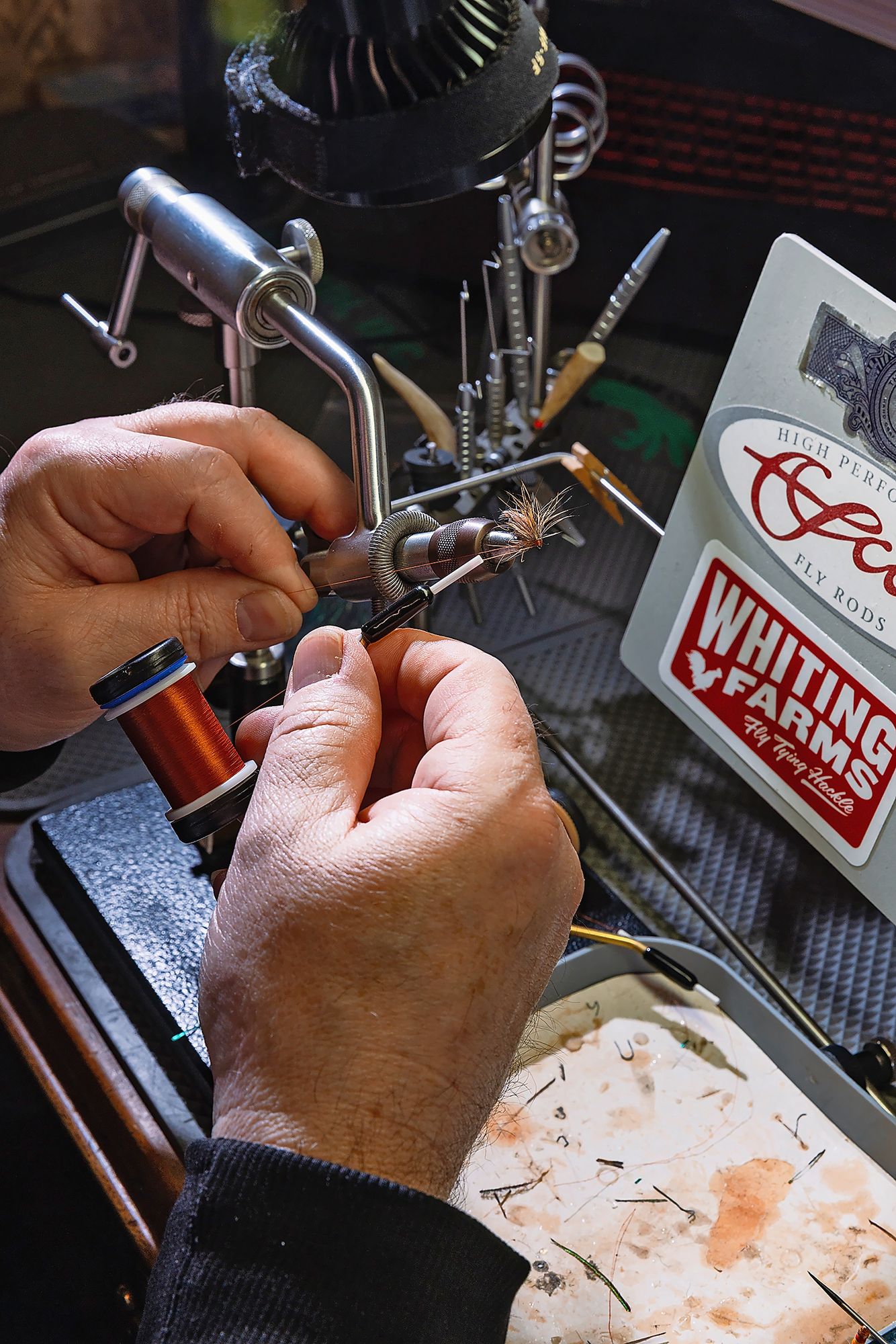 Ce boucher de formation, également photographe animalier amateur, travaille souvent de nuit, sur un étau de montage de mouche.