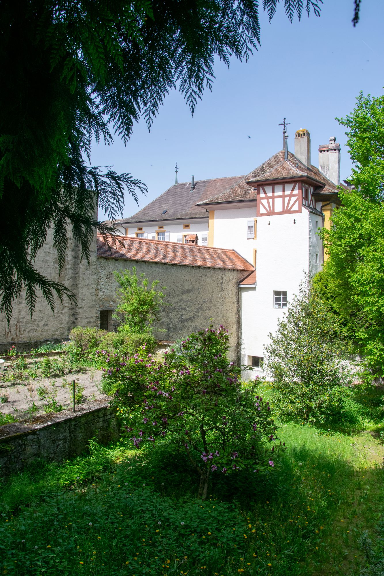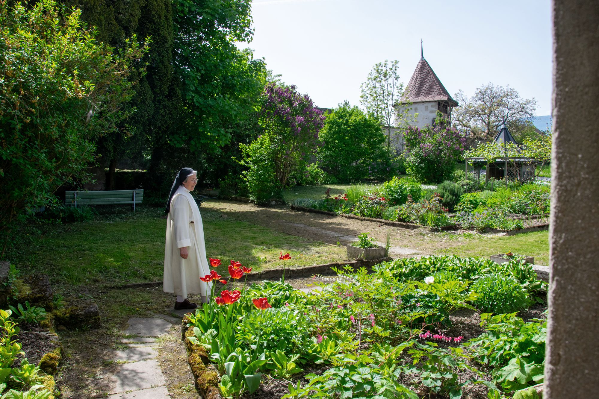 Beim Flanieren durch die engen Gassen der Altstadt von Estavayer-le-Lac stösst man unweigerlich auf die mittelalterlichen Stadtmauern. Hinter ihnen verbirgt sich ein Garten, der seit Jahrhunderten gepflegt wird und nur wenigen Auserwählten zugänglich ist. Schwester Anne-Sophie ist die derzeitige Hüterin dieses Zufluchtsortes. Anmutig und gut gelaunt empfängt sie uns in ihrer makellos weissen Nonnenkutte und führt uns über eine Hintertür in ihr grünes Juwel.