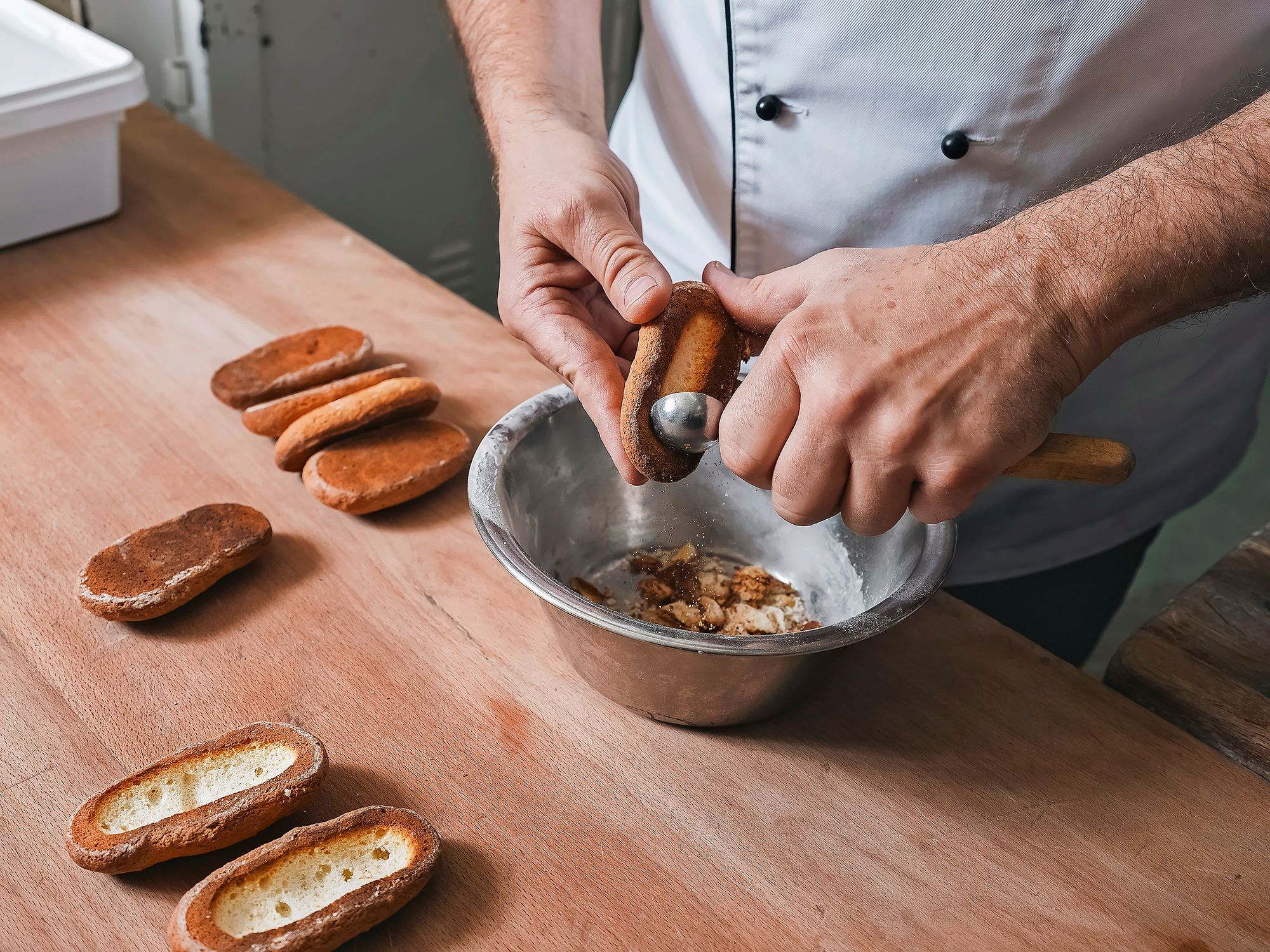 Pour Florian Défago, la matinée commence par la préparation des biscuits. Jaunes et blancs d’œufs – pondus à Aigle – sont battus séparément. En parallèle, le pâtissier pèse la farine. La pomme de terre a même une toute petite place parmi les ingrédients, sous la forme de fécule, pour la liaison. «Ça n’a rien de difficile, mais les œufs doivent être bien montés pour ne pas retomber. Et il ne faut pas tarder à dresser: c’est le plus dur.»