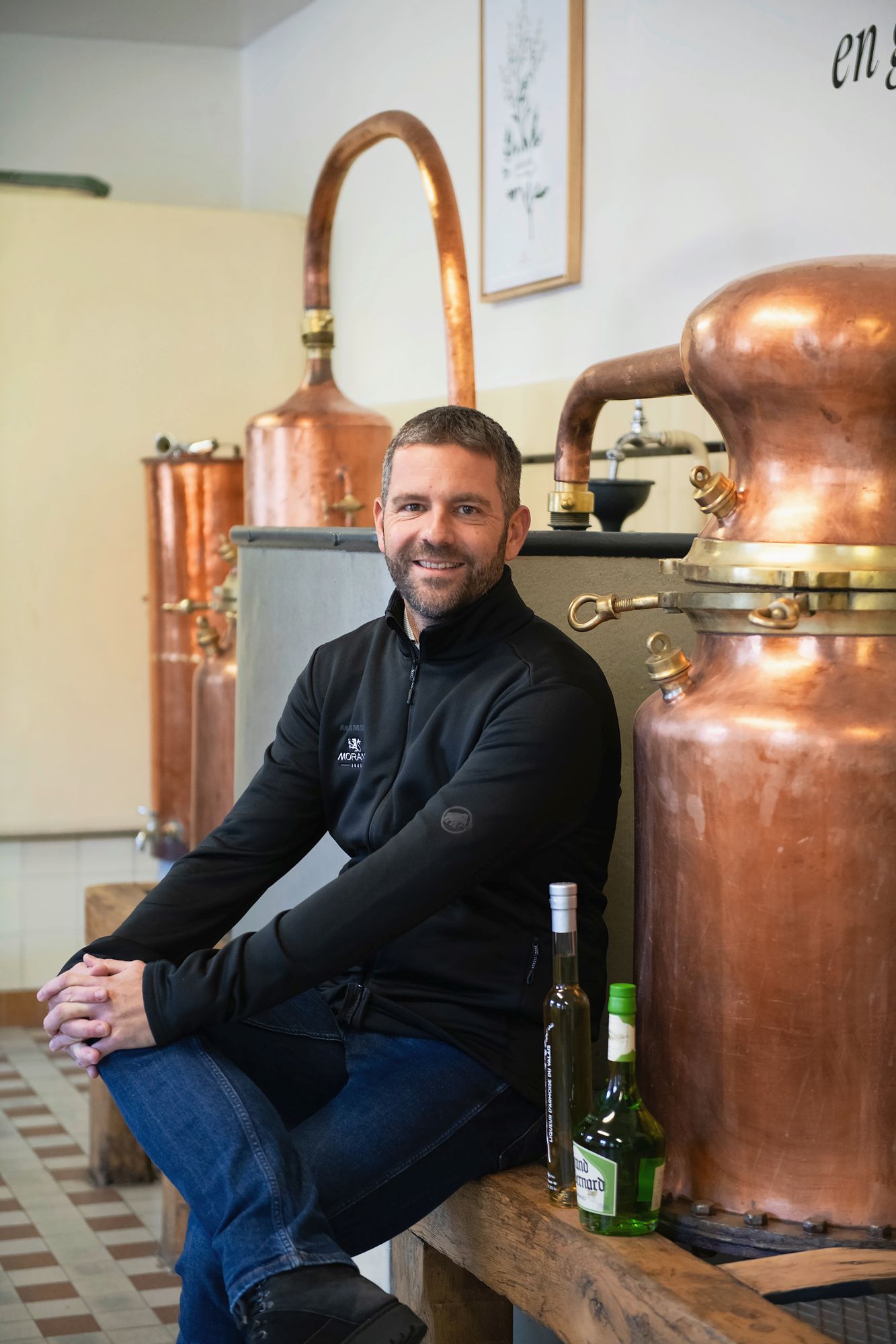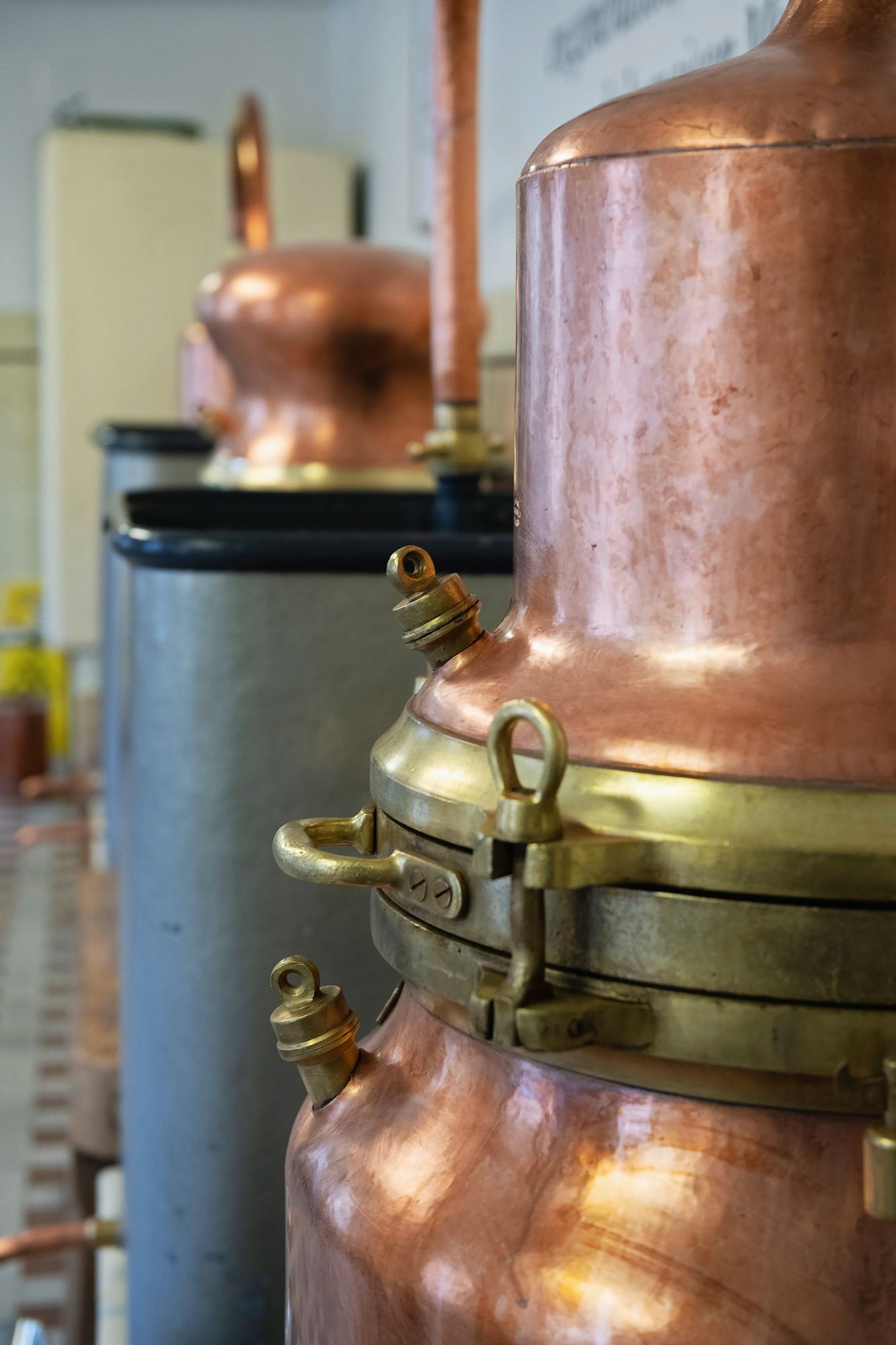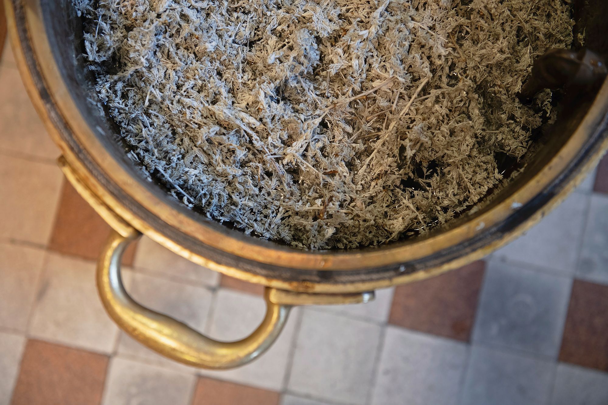 Caché derrière la boutique vitrée, un escalier étroit mène à un atelier centenaire, où des cuves en cuivre étincellent dans l’attente d’une énième distillation. Bientôt, un homme apparaît, en déboulonne les têtes amovibles pour y verser une préparation alcoolisée dans laquelle baignent des bouquets denses aux fines feuilles de couleur bleu-gris. Il referme les cuves, réajuste les cols. Quelques minutes plus tard, l’extraction peut commencer.