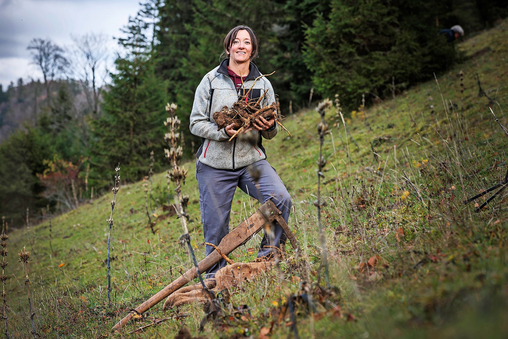 «Ici, c’est comme un emblème, tout le monde connaît une anecdote en lien avec la gentiane», relève la cheffe d’équipe. Des histoires, il y en a notamment autour du creusage, physiquement exigeant. Car contrairement à bien d’autres eaux-de-vie, celle de gentiane n’est pas tirée de fruits, mais de la partie souterraine de la plante.