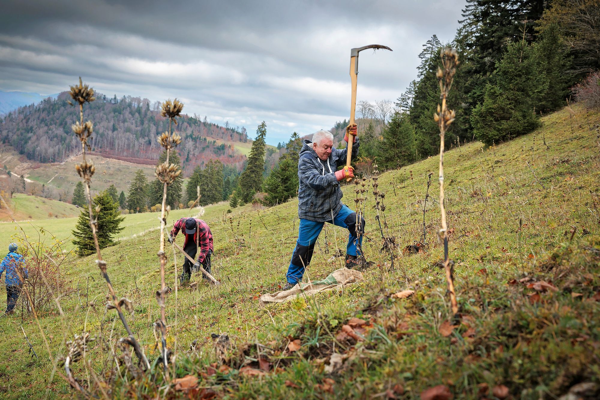 Un brin de fébrilité teinte les discussions autour d’Élodie Gerber. Rassemblés à Orvin (BE) devant la distillerie de l’Échelette, cinq volontaires ont reçu les instructions de la bouilleuse de cru et sont prêts à relever les manches pour aller taquiner la gentiane. Après un échauffement la semaine précédente à presser les pommes, ils ont suivi la présidente de la société d’arboriculture pour partir à la découverte de cette plante mythique des abords du Chasseral.