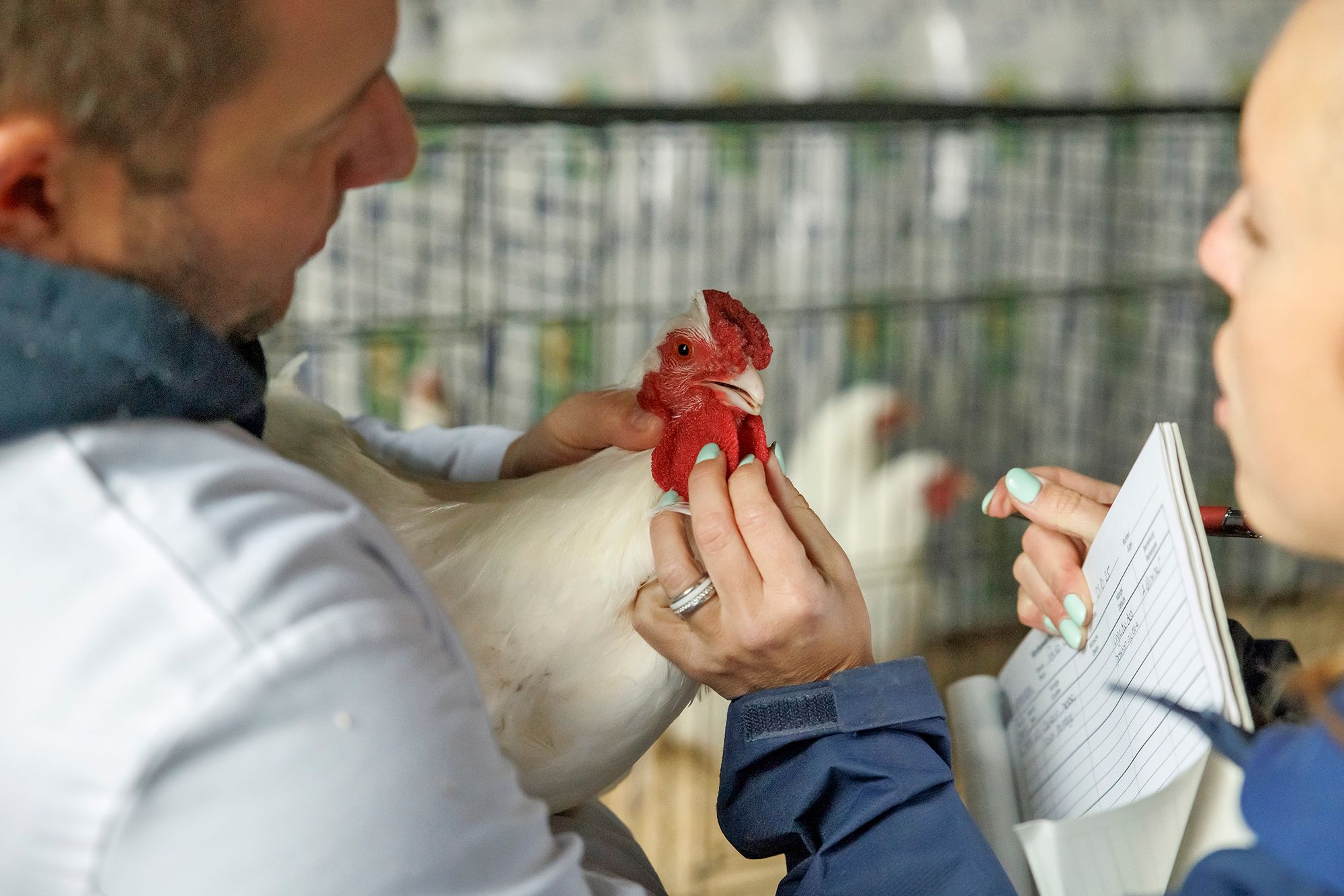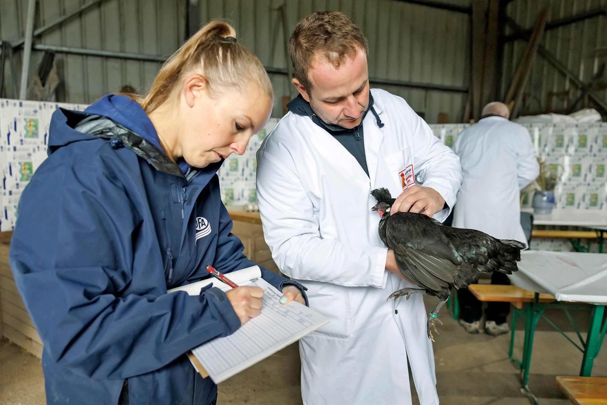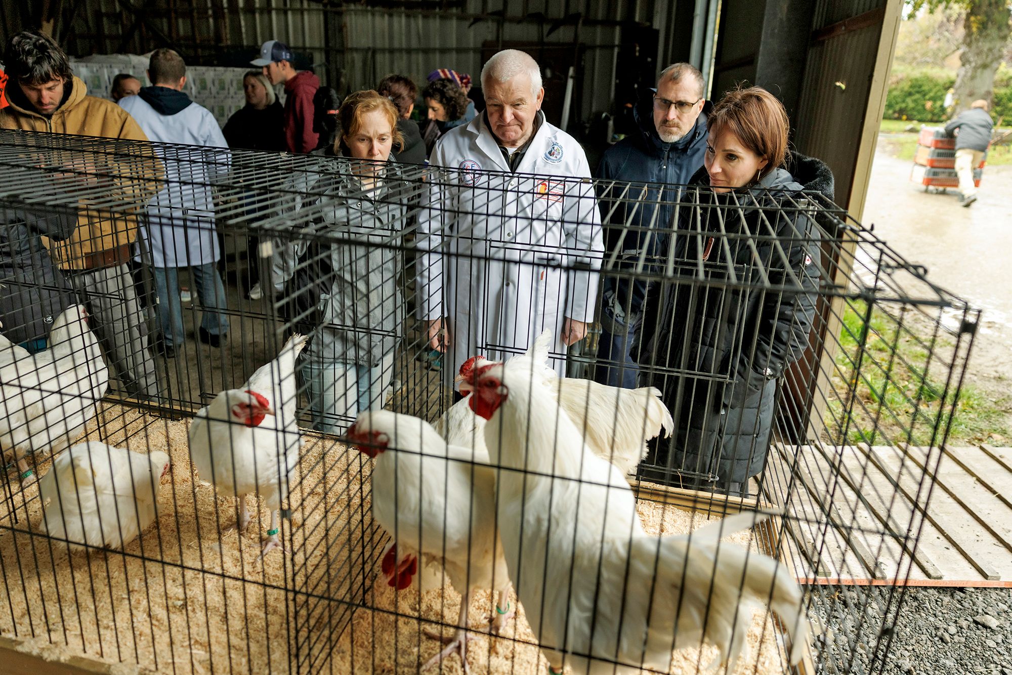 De grandes cages sont installées sur des tables et l’hôte de la manifestation y dispose de la litière. En blouse blanche, deux juges finissent de se préparer. Chacun d’eux est secondé par une secrétaire qui note scrupuleusement les appréciations des animaux. Les membres du comité de l’Association d’élevage de volailles menacées (AEVM), qui organisent cette journée, ont regroupé par plage horaire les animaux d’une même race.