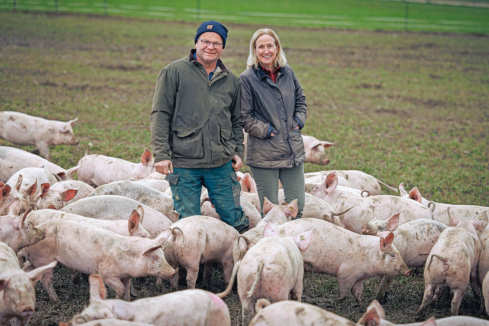 Depuis trente ans, la famille Steiner exploite la Ferme en Croix, à Vullierens (VD), où elle élève des cochons de pâturage. Chaque année, Rudolf et sa femme Caroline s’occupent de 900 animaux en liberté dans leurs champs, qui disposent de tunnels paillés leur servant d’abris et d’aires d’alimentation où ils trouvent à volonté un mélange de céréales contenant du blé et de l’orge.